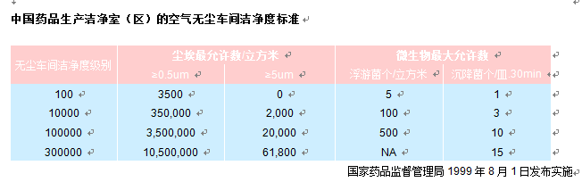 中國藥品潔凈室懸浮塵粒與潔凈度對照表